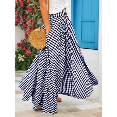 Women's elegant check pattern midi skirt, high waist slimming fullerene hem, 95% polyester 5% spandex lining