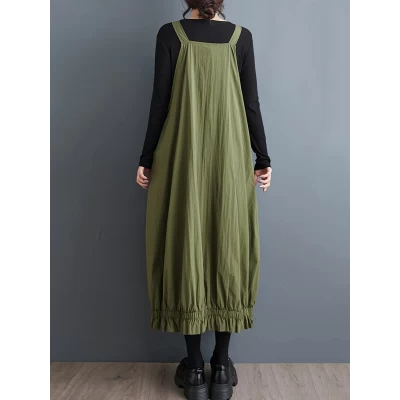 Women's Casual Black Suspender Midi Dress - Retro Style, Zippered, Ruffled Hem, Polyester, Perfect for Spring/Summer/Fall