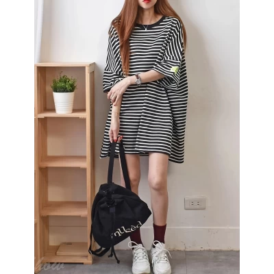 Women's Plus Size Striped Oversized T-Shirt Casual Summer Mid-Length Half Sleeve Black & White Vertical Stripes Loose Fit